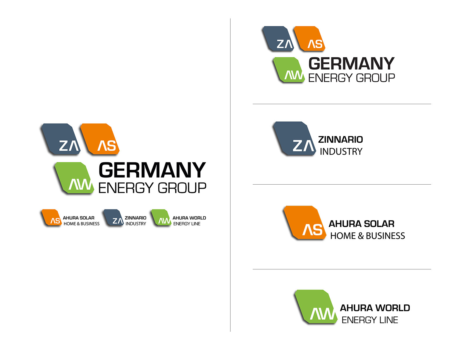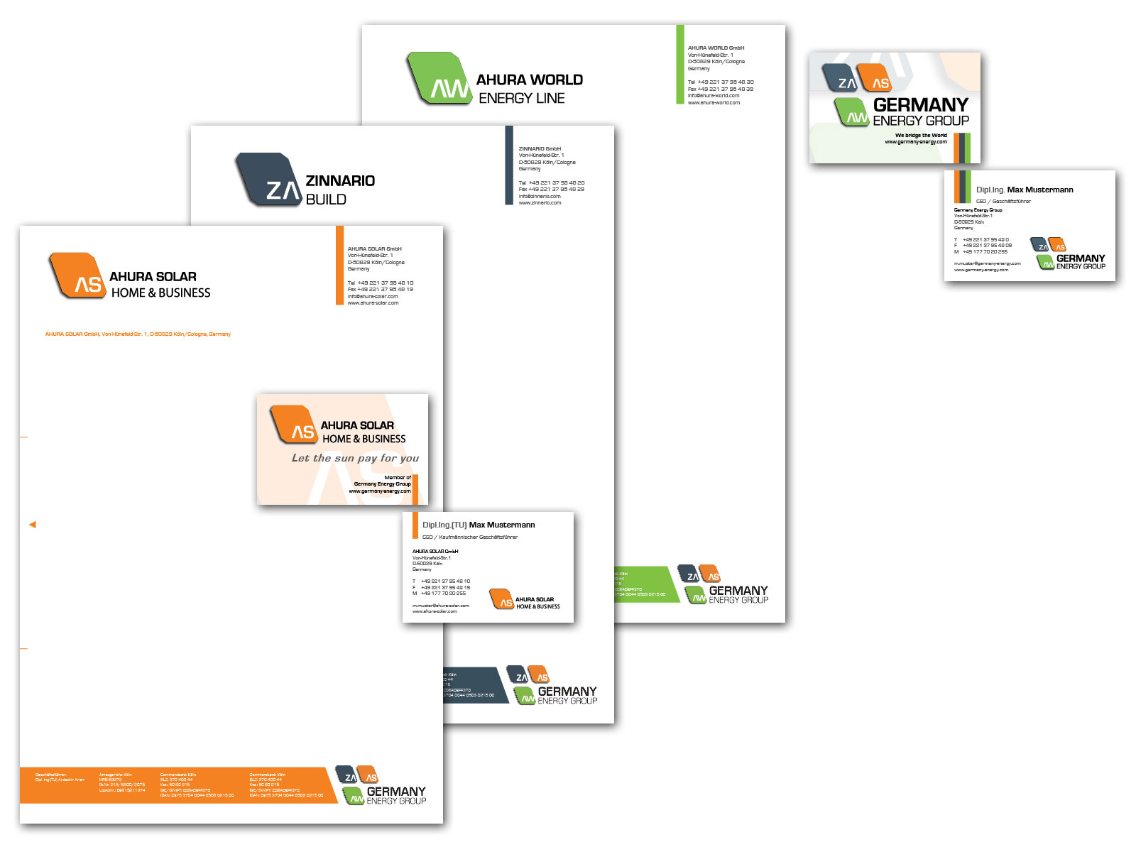 Complete corporate design work for a company that works in the area of solar energy and energy saving solutions. This included a Logo for the Head-organisation and 3 more for the different branches.