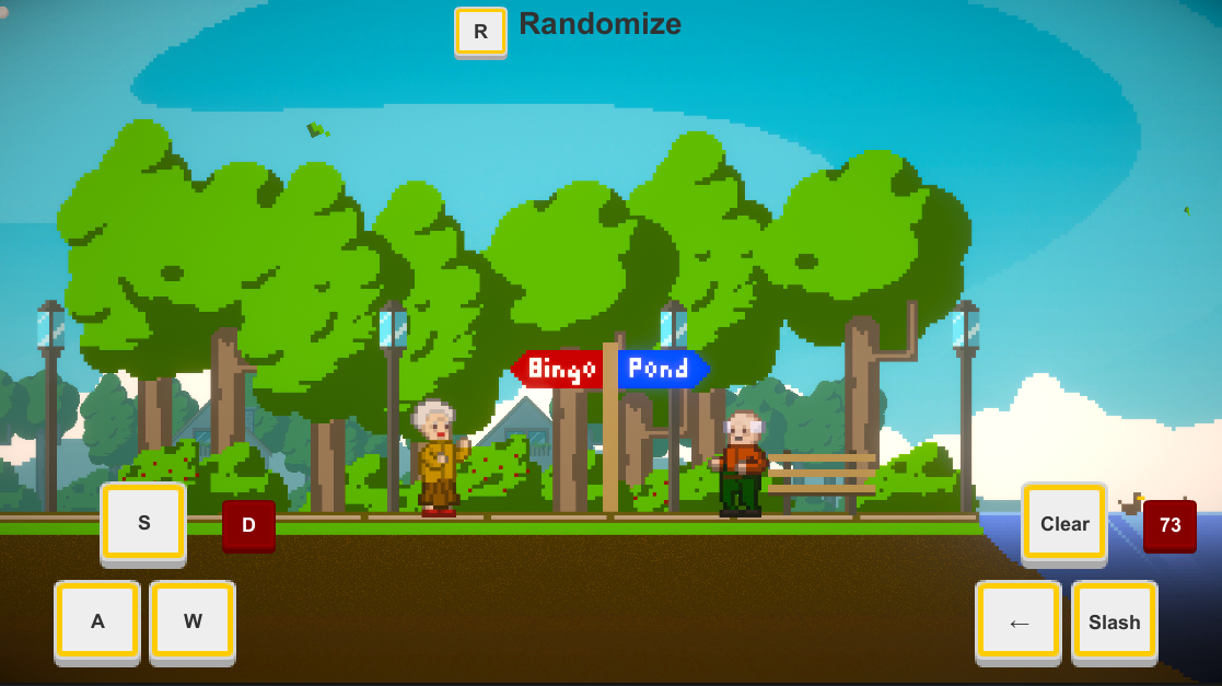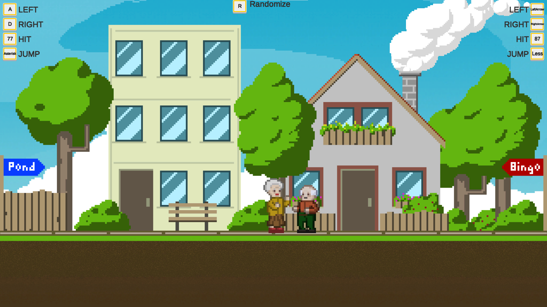 Two old neighbors are fighting over going to the pond or bingo. With each hit they forget their keybinding and the players have to find the correct keys.