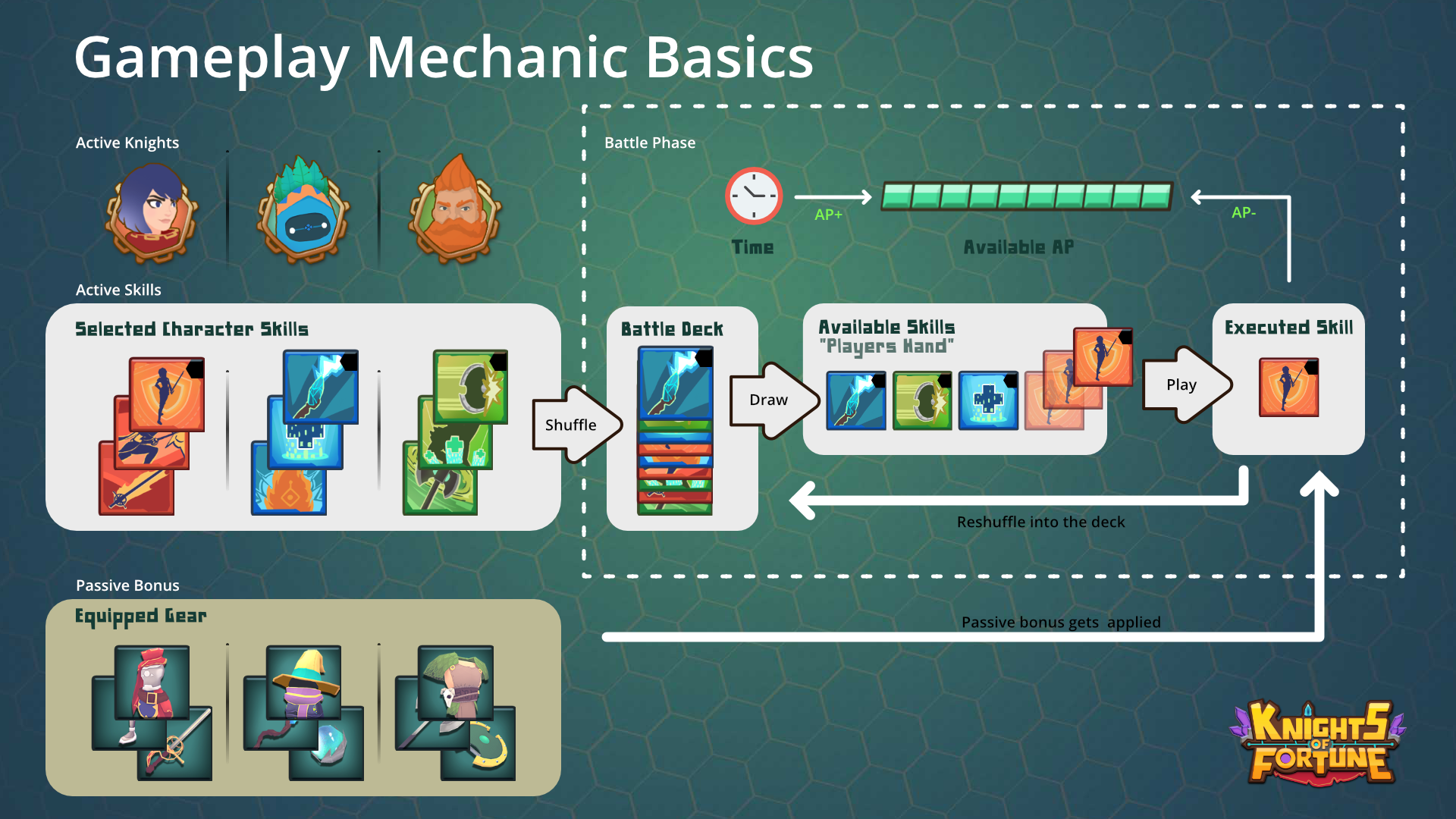Funded by Film und Medienstiftung NRW, Knights of Fortune is a cutting-edge mobile-friendly game featuring 3 vs. 3 PvP and PvE gameplay. This prototype blends deckbuilding mechanics with the active battle gamplay elements of a J-RPG games.